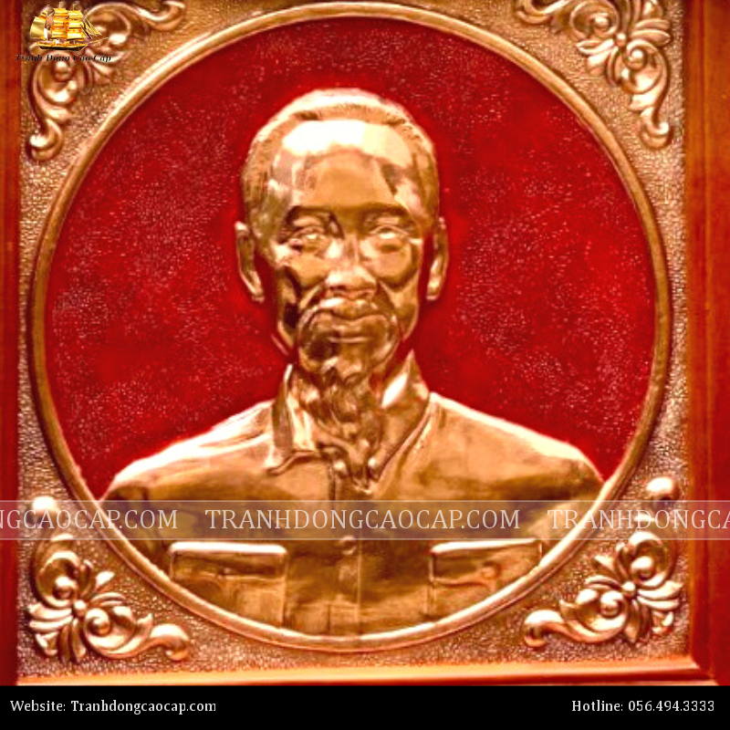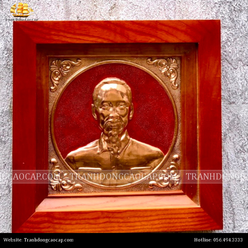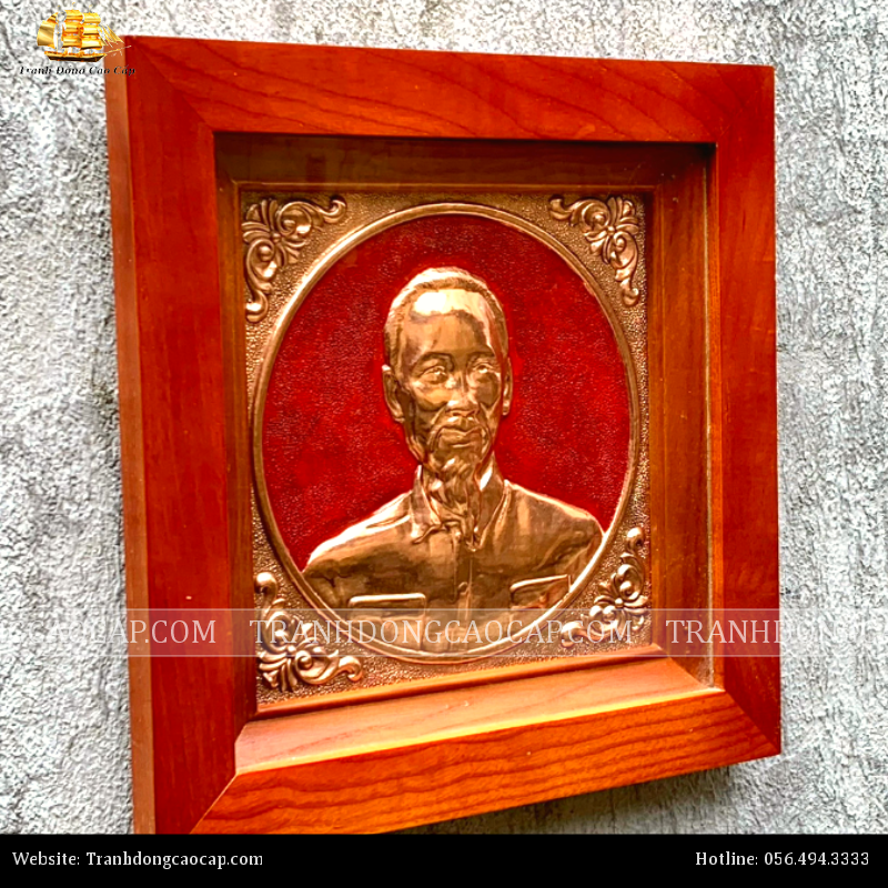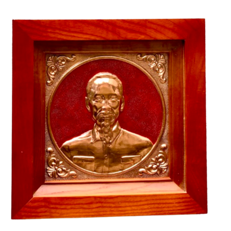 Tranh Bác Hồ 38x38cm đồng đỏ nền đỏ khung gỗ sồi