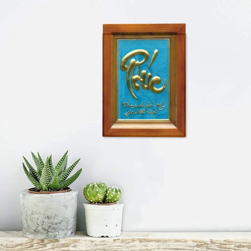 Tranh chữ Phúc 28x38cm không mạ nền xanh khung gỗ sồi