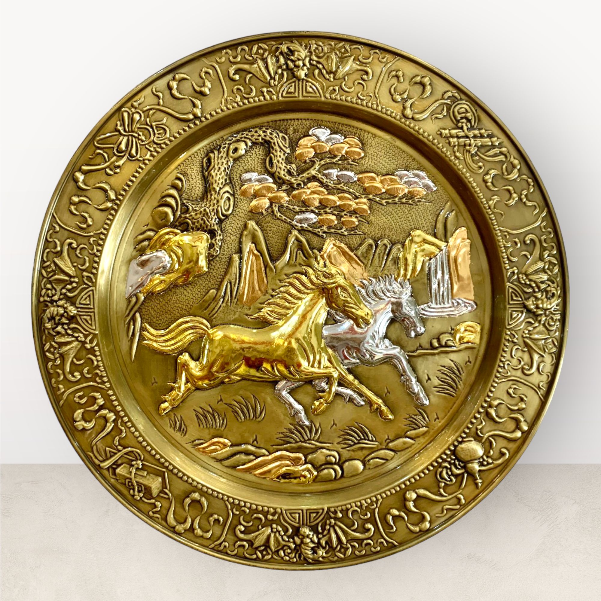 Tranh mâm đồng song mã dát vàng bạc đường kính 52cm